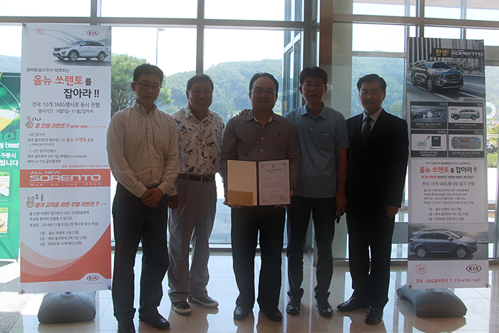SMG 골프투어에서 전국 10개 골프장에서 동시 진행하는 “올 뉴 쏘렌토를 잡아라!! 홀인원 이벤트에서 최초 홀인원 자에게 쏘렌토를 증정하는 홀인원은 행운의 골프장 오너스골프클럽에서 2014. 9. 5(금) LAKE COURSE 13H 에서 나왔다. 그러나 아쉬워 하지 말자, 두번째 이벤트 “참가자 추첨 이벤트” 는 그대로 진행중이니~~ 2014. 9. 5(금) ~ 11.02(일) 기간 내 이벤트에 참가한 모든 회원을 대상으로 추첨하여 1등에게 올뉴 쏘렌도 1대를 증정한다. 더불어, 태국골프투어 5박 7일 여행권(4인, 항공권 제외)이나 MFS or YES 골프 풀셋트 중 선택한 상품을 제공하고 추가로 현대오일뱅크 주유상품권(1,000,000원 상당)을 제공한다. (현대오일뱅크 주유상품권은 행시기간 내 한정 제공) |
